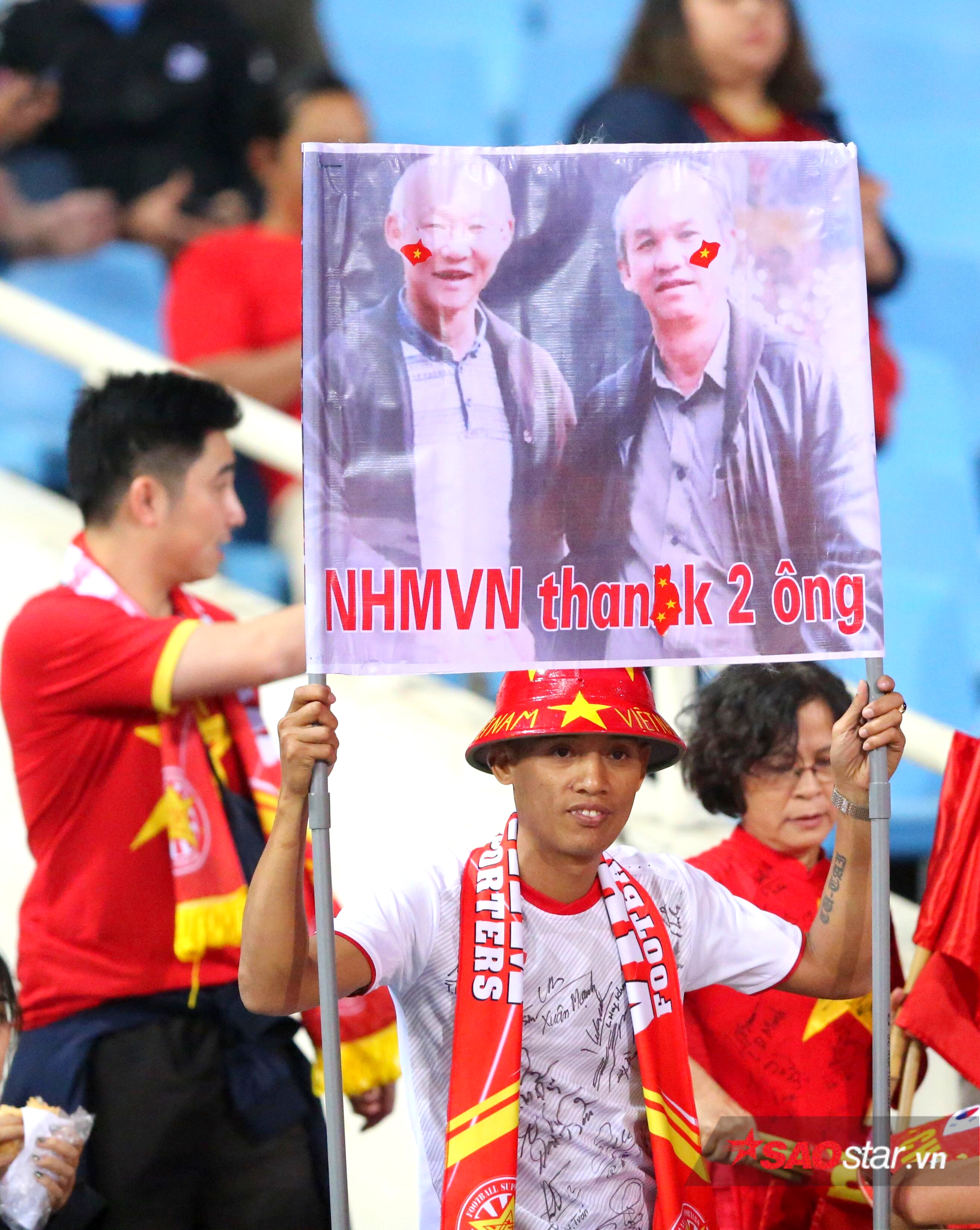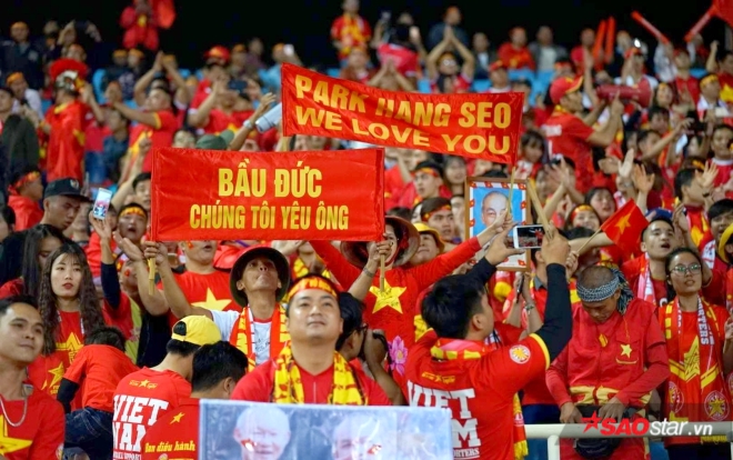 “Bầu Đức, chúng tôi yêu ông!”; “Người hâm mộ Việt Nam cảm ơn Bầu Đức, HLV Park”…. nổi bật trên khán đài sân Mỹ Đĩnh.