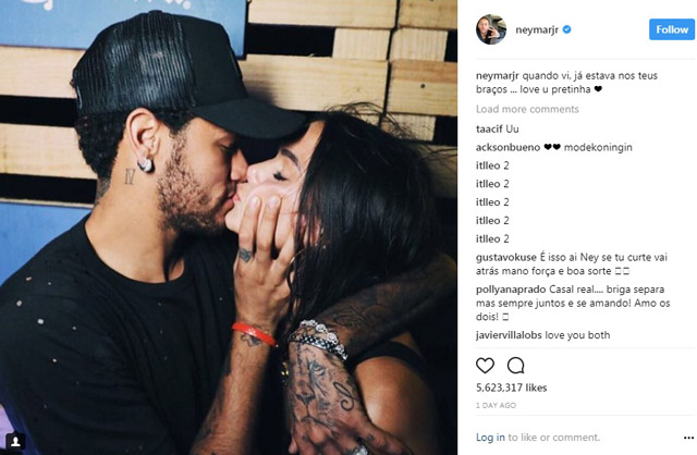Do Ligue 1 đang trong giai đoạn nghỉ Đông nên Neymar đã quyết định trở về quê nhà Brazil để đoàn tụ cùng các thành viên trong gia đình nhân dịp năm mới 2018. Tại xứ sở Samba, Neymar đã đăng tải bức ảnh anh “khóa môi” Bruna Marquezine với status khá lãng mạn: “Khi tôi nhìn thấy em, em ở trong vòng tay tôi… Tôi sẽ yêu và giữ em lại”.