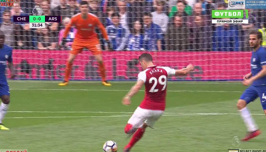 Phút 32: Cú sút của Xhaka là rất có lực nhưng bóng đi ra mép lưới.