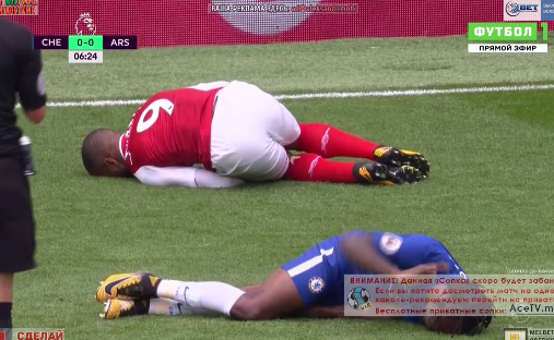 Phút 7: Lacazette và Moses đang nằm sân đau đớn sau pha va chạm quyết liệt.