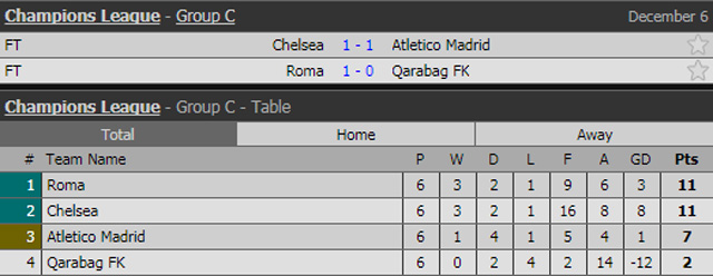 Với kết quả hòa 1-1 ở trận này, Chelsea chỉ đứng vị trí thứ 2 tại bảng C khi cùng có được 11 điểm qua 6 trận như AS Roma nhưng xếp sau vì thua thành tích đối đầu. Trong khi đó, Atletico xếp thứ 3 với 7 điểm. Điều đó có nghĩa, thầy trò HLV Diego Simeone phải xuống chơi ở vòng 1/16 Europa League.