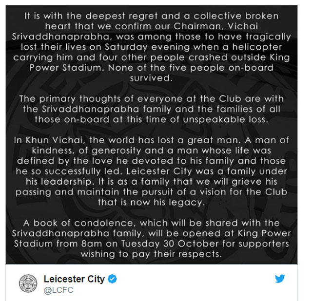 Theo đó, trang chủ của Leicester đã ra một thông báo trên mạng xã hội Twitter có đoạn ghi rằng: “Đây là sự đau đớn và tiếc nuối lớn nhất đối với đội bóng. Chúng tôi xin xác nhận rằng, Chủ tịch Vichai Srivaddhanaprabha là một trong năm nạn nhân ở vụ rơi trực thăng hôm thứ bảy 27/10. Không ai trong số họ còn sống sót.”