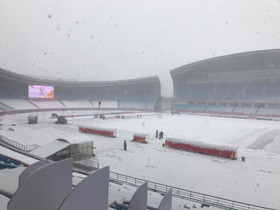 Tuyết vẫn đang rơi ở sân Olympic Thường Châu. Ảnh: HMN