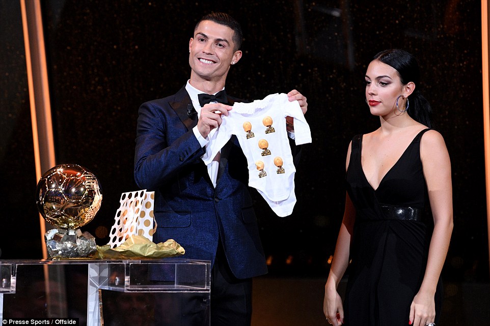 Cùng chia vui với anh trên bục nhận giải ở Gala do France Football tổ chức còn có mẹ đẻ, bà Maria Aveiro và con trai cả Cristiano Ronaldo Junior. Đặc biệt, cô bạn gái xinh đẹp Georgina Rodriguez của Ronaldo cũng bất ngờ nhận được món quà từ BTC. Đó là chiếc áo trẻ sơ sinh màu trắng có in hình 5 “Quả bóng Vàng” tượng trưng cho kỉ lục mà CR7 đuổi kịp đại kình địch Messi.