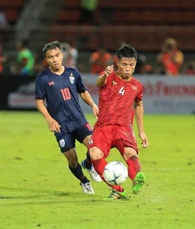 Trung vệ Bùi Tiến Dũng trong một pha bóng tranh chấp với Chanathip. Ảnh: FBNV.