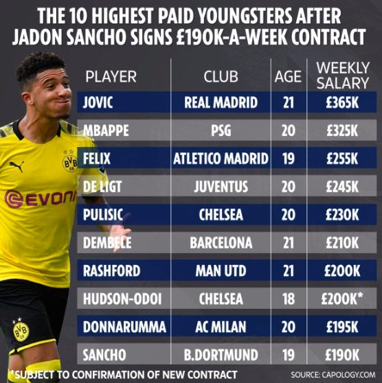 Hiện giao kèo giữa Jadon Sancho và đội bóng nước Đức còn thời hạn đến năm 2022, nhận mức lương 75.000 bảng/tuần.