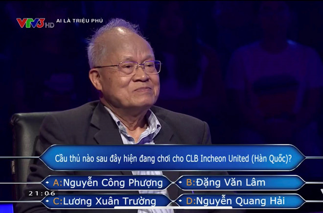 Ở câu hỏi thứ 7 tương đương với mốc thưởng 6 triệu đồng, người chơi phải đối mặt với câu hỏi thuộc lĩnh vực thể thao: “Cầu thủ nào sau đây đang chơi cho CLB Incheon United của Hàn Quốc?”.