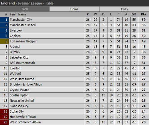 BXH Premier League sau các trận đã kết thúc ở vòng 26.