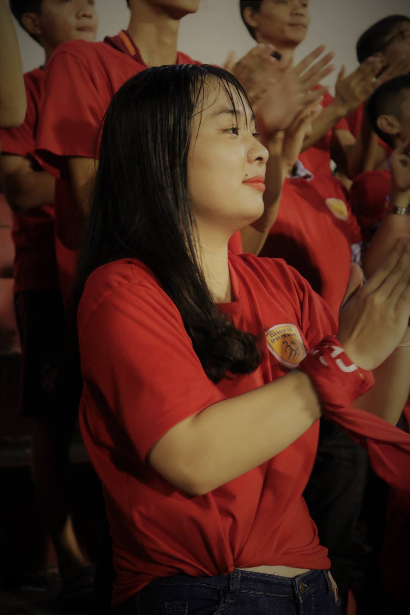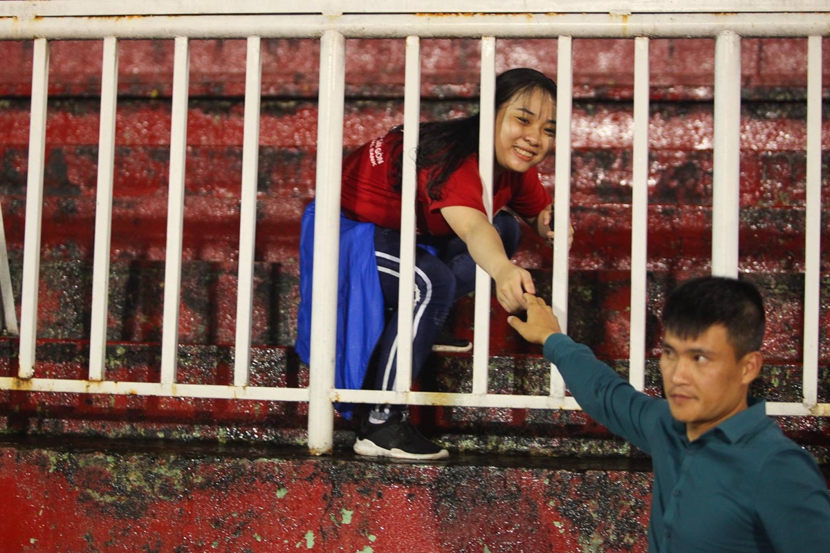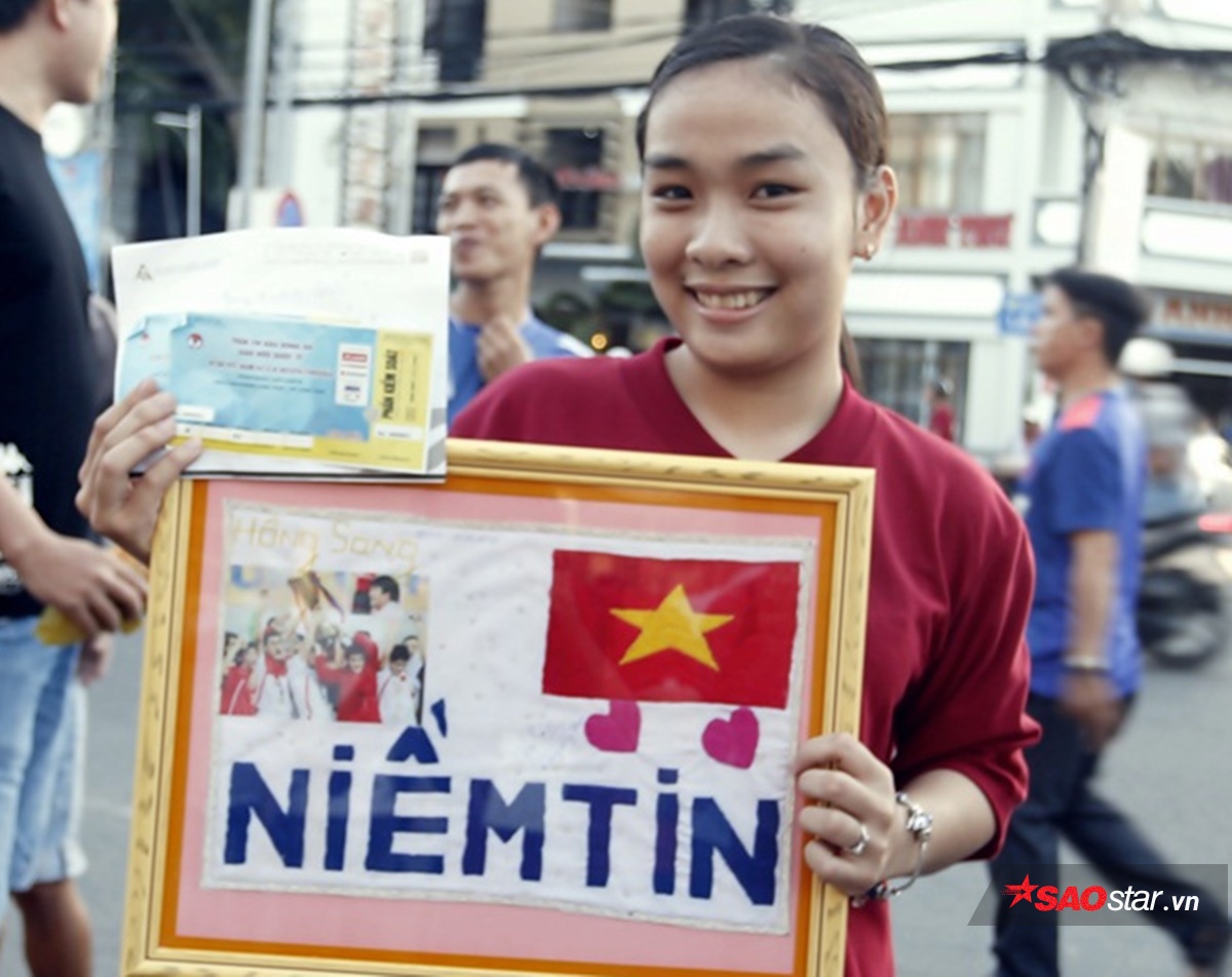 Cô gái trong tấm hình là Hồng Sang - sinh viên năm nhất ở một trường Đại học thuộc quận 7, TP.HCM. Hồng Sang hiện đang là thành viên trong Hội CĐV trẻ của CLB TP.HCM. Đó cũng là lý do cô gái người Đồng Tháp xuất hiện ở khán đài sân Thống Nhất.