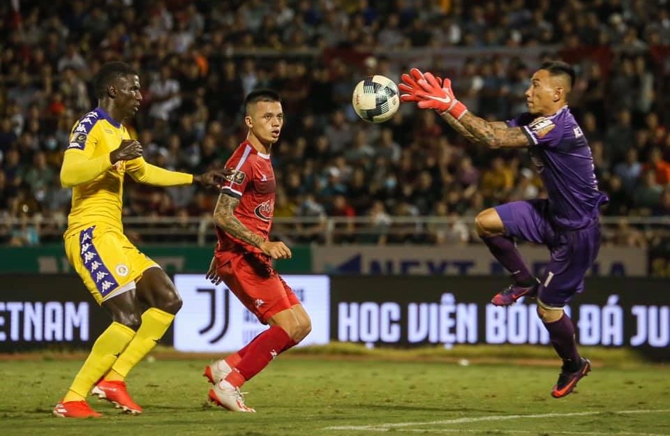 CLB Hà Nội đã đổi thành áo vàng để tránh trùng với áo tím của thủ môn CLB TP.HCM. Ảnh: CLB TP.HCM