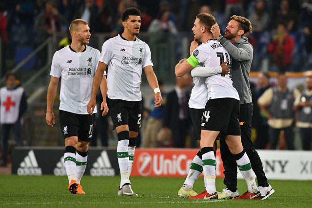 Các cầu thủ Liverpool ăn mừng chiến thắng.