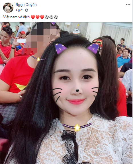 Tự dưng thương người yêu em dã man. Nước mắt cứ chảy xuống mà không biết cách nào để hét to là anh ơi em ngồi bên này chứ không phải em về đâu. Người đàn ông yêu em luôn lẵng mạn như vậy. Chưa bao giờ ngừng tìm kiếm em dù bất cứ ở đâu. 1 trận đấu quá nhiều cảm xúc . Chúc mừng anh. Chúc mừng đội tuyển Việt Nam”, Ngọc Quyên chia sẻ về lý do khóc ở Mỹ Đình.