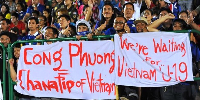 Băng rôn của CĐV Thái: “Công Phượng - Chanathip của Việt Nam”.