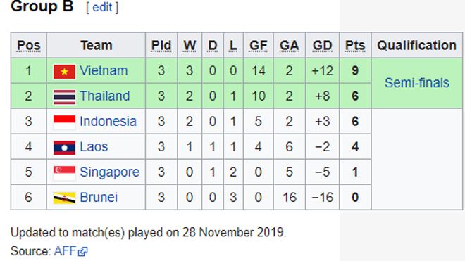 Màn lội ngược dòng đẳng cấp của U22 Việt Nam trước U22 Indonesia đã mở toang cánh cửa vào vòng bán kết SEA Games 30 dành cho thầy trò HLV Park Hang Seo. Với 3 điểm giành được tại trận đấu mới đây nhất, U22 Việt Nam tiếp tục duy trì vị trí đầu bảng sau 3 trận toàn thắng, hiệu số bàn thắng bại là +12.