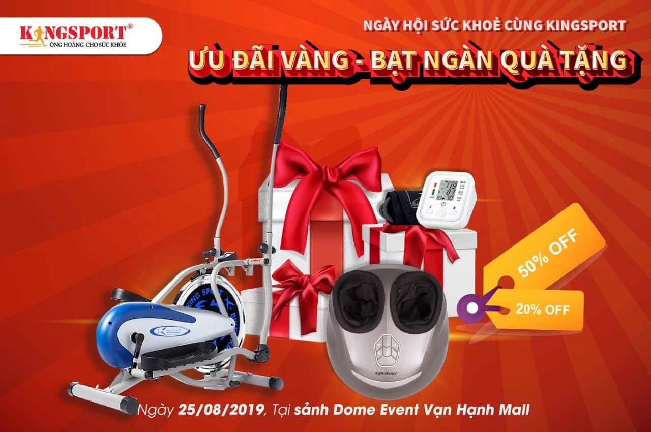 Đặc biệt Kingsport khuyến mãi tháng 08 đến 42%. Ngay tại sự kiện, quý khách mua hàng sẽ nhận ngay voucher giảm thêm 5-10%, cơ hội bốc thăm may mắn để nhận xe đạp tập Xbike không yên, massage chân DF 836