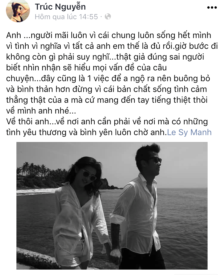 Để động viên tinh thần cho chồng mình, người mẫu Trúc Nguyễn đã lần đầu lên tiếng sau biến cố: “Anh. Người mãi luôn vì cái chung luôn sống hết mình vì tình vì nghĩa vì tất cả anh em thế là đủ rồi. Giờ bước đi không còn gì phải suy nghĩ. Thật giả đúng sai người biết nhìn nhận sẽ hiểu mọi vấn đề của câu chuyện”.