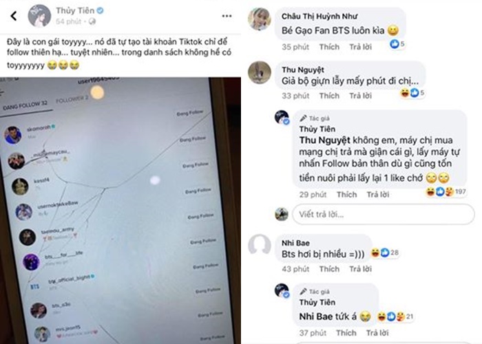 Đặc biệt, qua danh sách theo dõi trên tiktok , thì có thể thấy bé Gạo là fan bự của BTS. Nàng ca sĩ thể hiện sự ghen tị một cách rất đáng yêu, khiến NHM hết lời khen dễ thương. Ngoài ra, fans còn chọc Thủy Tiên rằng: “Giả bộ giận lẩy mấy phút đi chị“.