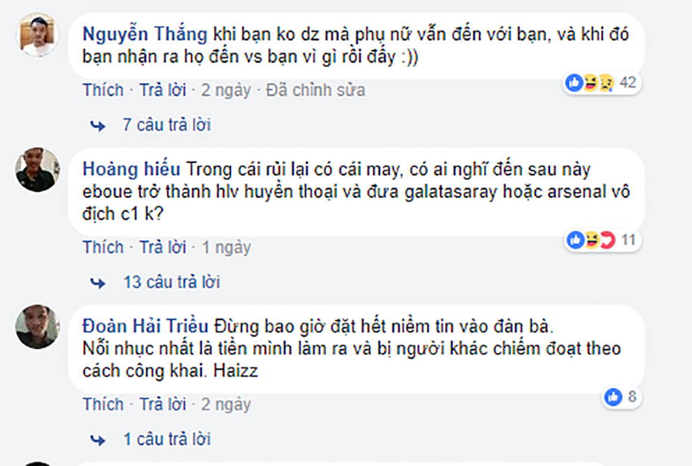 Câu chuyện của Eboue cũng khiến nam giới thêm mất lòng tin vào phụ nữ. Cánh đàn ông khắp nơi đang truyền tai nhau những bài học rút ra từ biến cố của cựu cầu thủ Arsenal.
