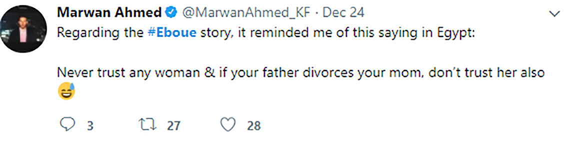 “Câu chuyện của Eboue làm tôi nhớ đến một lời nhắc của người Ai cập: Đừng bao giờ tin vào phụ nữ, ngay cả khi bố bạn mà ly hôn với mẹ bạn thì cũng đừng tin bà ấy nốt”.