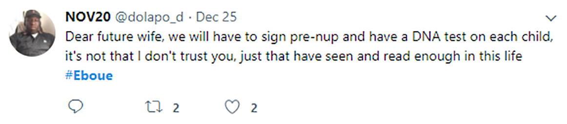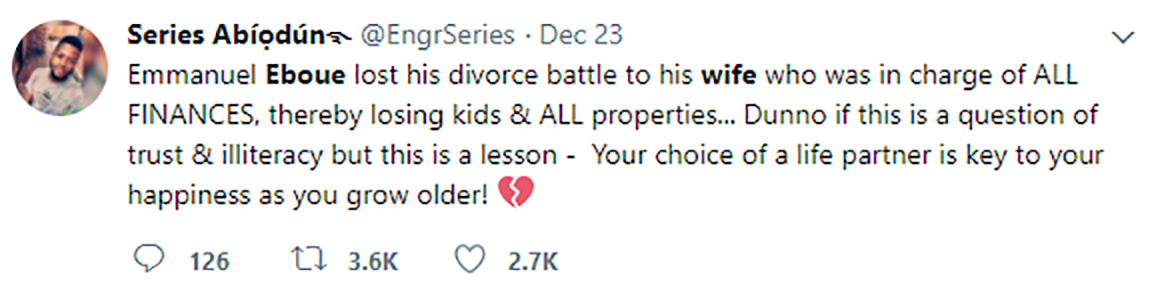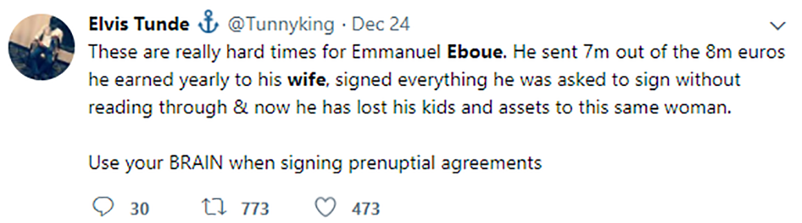 “Emmanuel Eboue đã thua kiện sau khi ly hôn với vợ. Cô vợ đã chiếm trọn tiền bạc, quyền nuôi con và toàn bộ tài sản. Chẳng biết lí do của tấn bi kịch có phải nằm ở sự tin tưởng và nền giáo dục hay không nhưng rõ ràng câu chuyện này đã dạy cho chúng ta một bài học: Việc lựa chọn bạn đời là chìa khóa cho hạnh phúc về sau!”