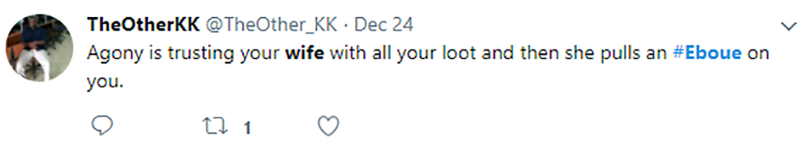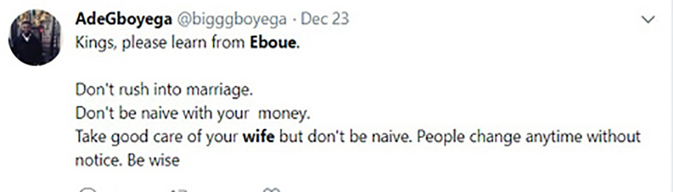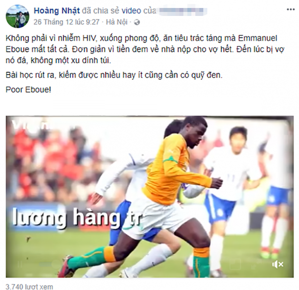 “Này anh em, xin hãy rút kinh nghiệm từ “tiền bối” Eboue: Đừng kết hôn vội vã. Đừng lơ là với tiền bạc. Yêu thương vợ nhưng vẫn tỉnh táo. Con người thường thay đổi chóng mặt khó lường. Hãy thông minh lên!”