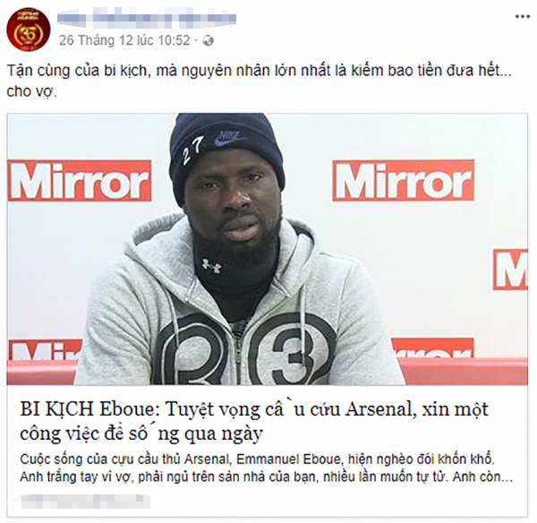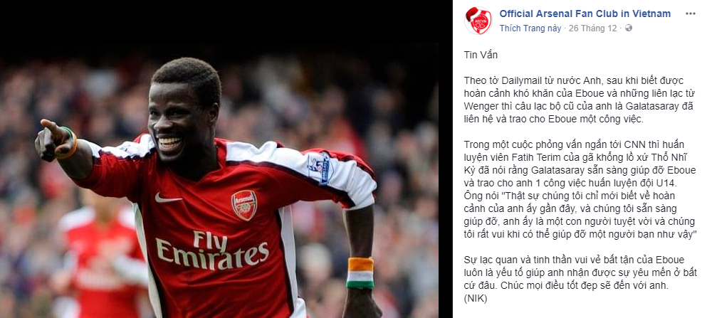 Fanpage chính thức của Hội CĐV Arsenal tại Việt Nam tỏ ra vui mừng khi Eboue được giúp đỡ.