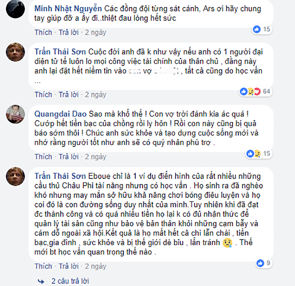 Cư dân mạng cũng bày tỏ sự thông cảm, động viên với Eboue và tỏ ra đặc biệt bức xúc với hành động nhẫn tâm của người vợ.