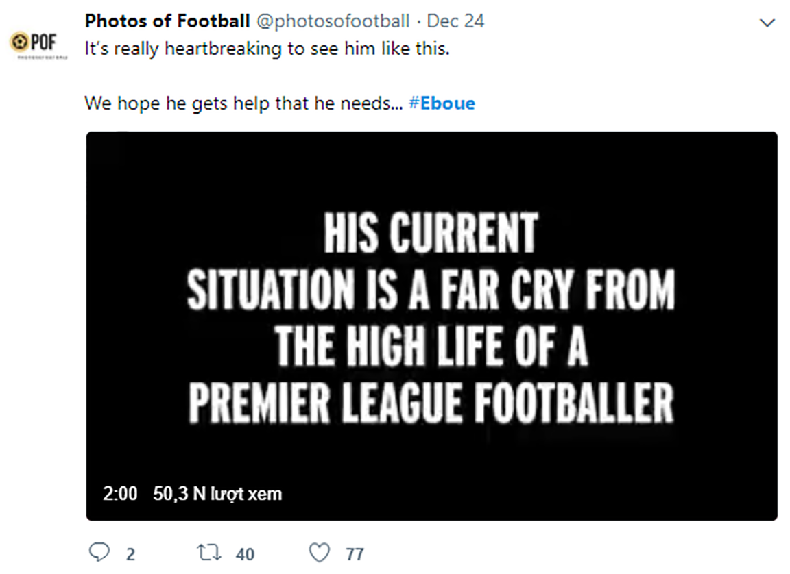 Trang Photos of Football đã chia sẻ một đoạn clip ngắn kể về bi kịch của Eboue kèm dòng trạng thái:” Thật đau xót khi thấy anh ấy (Eboue) rơi vào hoàn cảnh này. Hy vọng anh sẽ được giúp đỡ tận tình”.