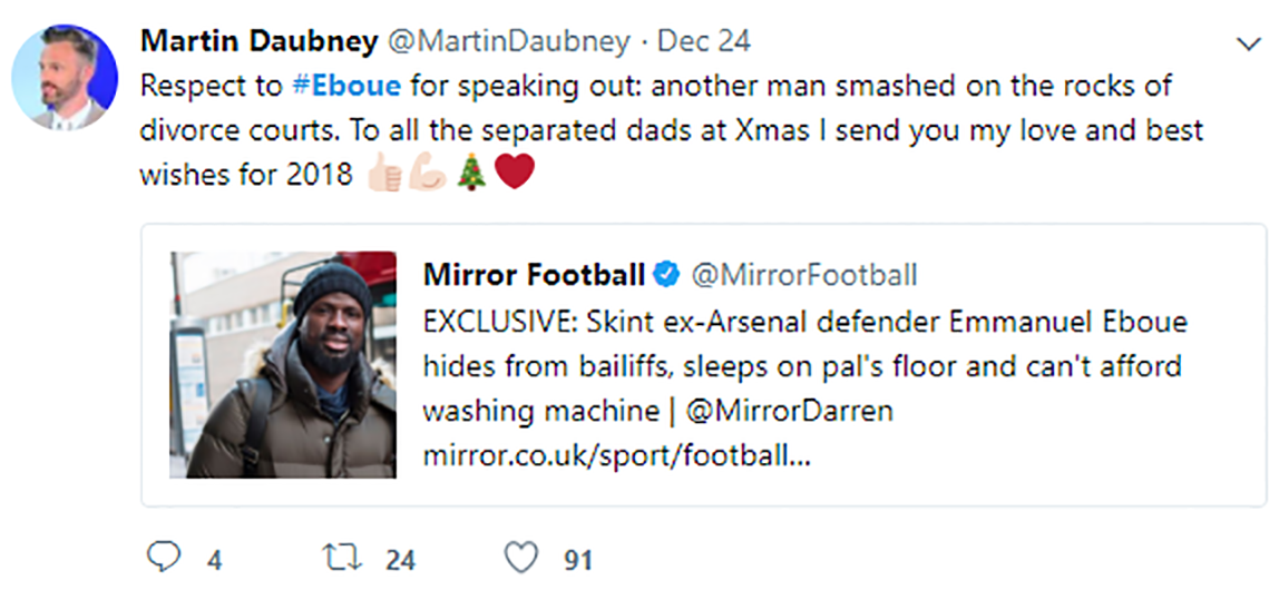 “Ngưỡng mộ Eboue vì đã can đảm nói ra sự thật. Lại một người đàn ông nữa cảm thấy bất bình vì phán quyết sau khi ly hôn. Gửi đến anh những tình cảm chân thành và mong anh có một năm 2018 nhiều tốt đẹp”.