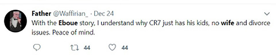 “Từ chuyện của Eboue, tôi đã hiểu vì sao CR7 chỉ có con chứ tuyệt nhiên không kết hôn hay ly hôn. Vậy mới khỏe!”