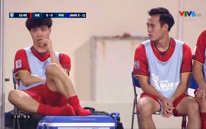 Đó là bức ảnh cả hai ngồi dự bị ở trận bán kết lượt về ở AFF Cup 2018 tại Mỹ Đình. Biểu cảm hài hước của Công Phượng đã tạo ra bức meme để đời với gương mặt thẫn thờ và dáng ngồi bá đạo.