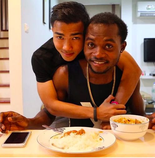 Chanathip quàng cổ đồng đội Gilbert Koomson ở CLB BEC Tero Sasana tại bàn ăn.