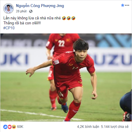 Ngay khi tiếng còi mãn cuộc vang lên, tiền đạo ĐTVN đã mau chóng đăng dòng trạng thái vui sướng trên trang cá nhân: “Lần này không lừa cả nhà nữa nhé. Thắng rồi bà con ơi !!!!”.