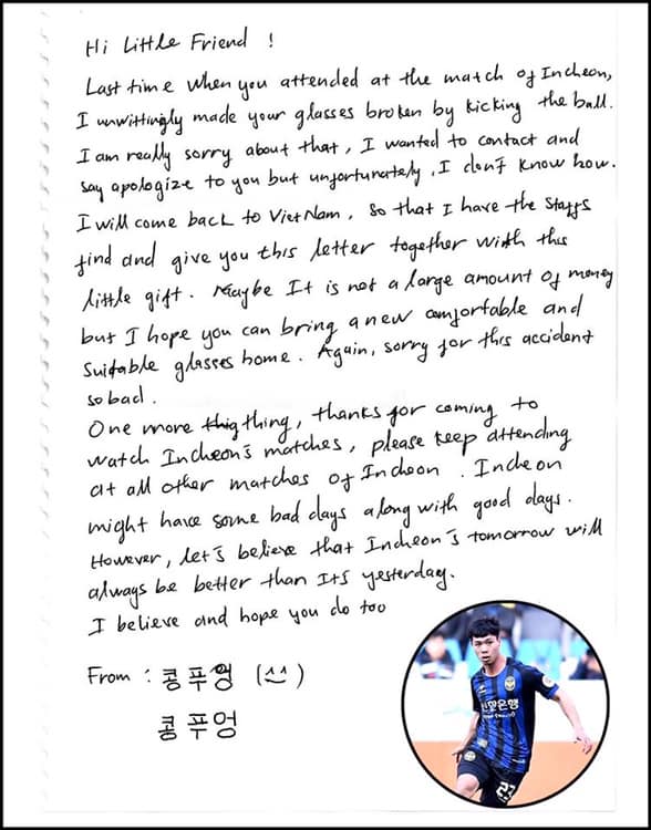 Cụ thể, một cậu bé người Hàn Quốc đến để theo dõi trận đấu của Incheon United nhưng không may trong lúc thi đấu Công Phượng đã vô tình sút bóng làm hỏng kính của cậu bé. Sau trận đấu, Công Phượng cảm thấy rất có lỗi và tìm mọi cách để tìm ra thông tin của cậu bé nhưng vẫn không được. Thời gian về Việt Nam lại gần kề, không còn cách nào khác Công Phượng đã để lại một bức thư tay viết bằng Tiếng Anh để xin lỗi và đền bù thiệt hại cho cậu bé.