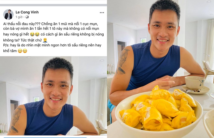 Mới đây, Công Vinh đã đánh thức vị giác cộng đồng mạng với bức ảnh chụp bên tô sầu riêng vàng ươm. Tuy nhiên. thay vì dành lời cảm thán cho nó, thì chàng cầu thủ lại chia sẻ nỗi lòng không chỉ của riêng ai: “Ai thấu nỗi đau này??? Chồng ăn 1 múi mà nổi 1 cục mụn, còn bà vợ mình ăn 1 lần hết 1 tô này mà không có nổi mụn hay nóng gì hết có cách gì ăn sầu riêng không bị nóng không ta? Tức thật chứ. Hay là do nhìn mặt mình ngon hơn tô sầu riêng nên hay khổ tâm”.