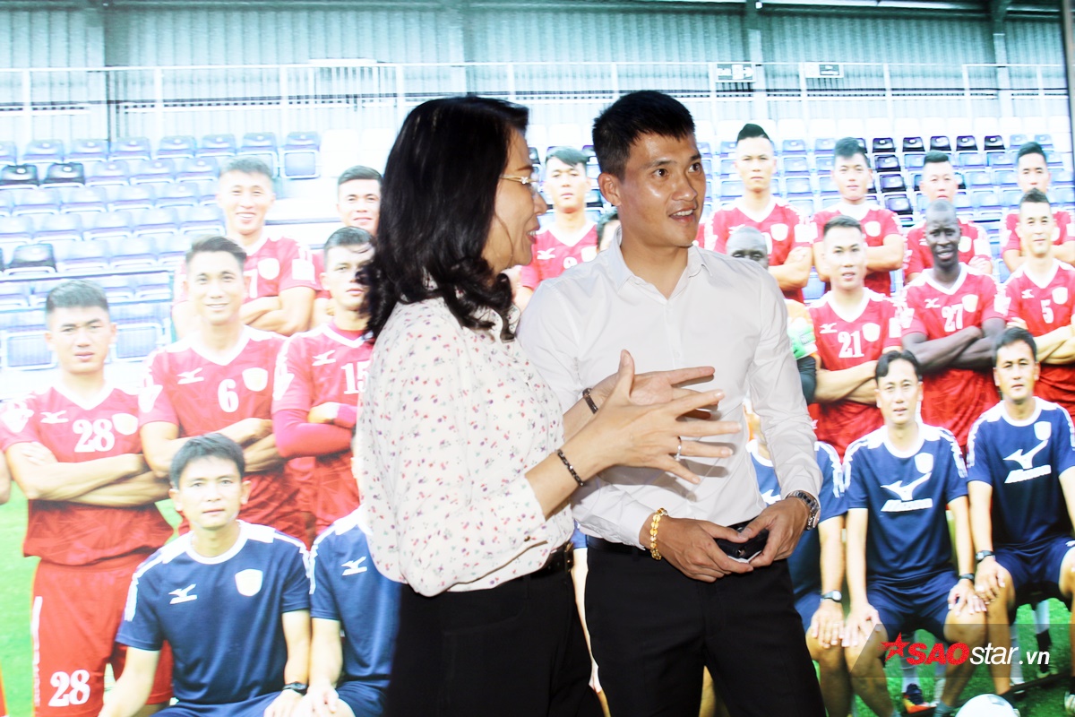 Bà Nguyễn Thị Thu và Công Vinh trò truyện sôi nổi trong phòng truyền thống bóng đá TP.HCM.