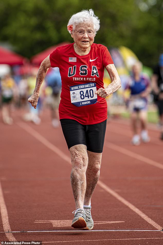 Chứng kiến những bước chạy cua bà Hawkins, ít người có thể nghĩ là bà năm nay đã qua tuổi 100. Kết thúc phần thi của mình, bà phá kỷ lục thế giới với một người trên 100 tuổi, khi chạy 50m chỉ mất 21.09 giây.