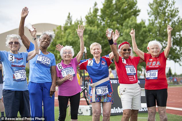 Bà Hawkins chụp ảnh cùng các vận động viên cao tuổi khác tại giải chạy.