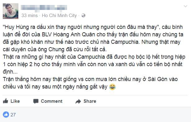 Công Phượng và Quang Hải không phải là 2 nhân vật được nhắc đến nhiều nhất sau trận Việt Nam - Campuchia mà đó lại là cặp đôi BLV Việt Phương và Anh Quân. Trên mạng, nhiều ý kiến cho rằng 2 BLV này “nói quá nhiều” hay thậm chí là “chém gió”. Một CĐV thậm chí còn đăng ảnh đang… vái sống các BLV.