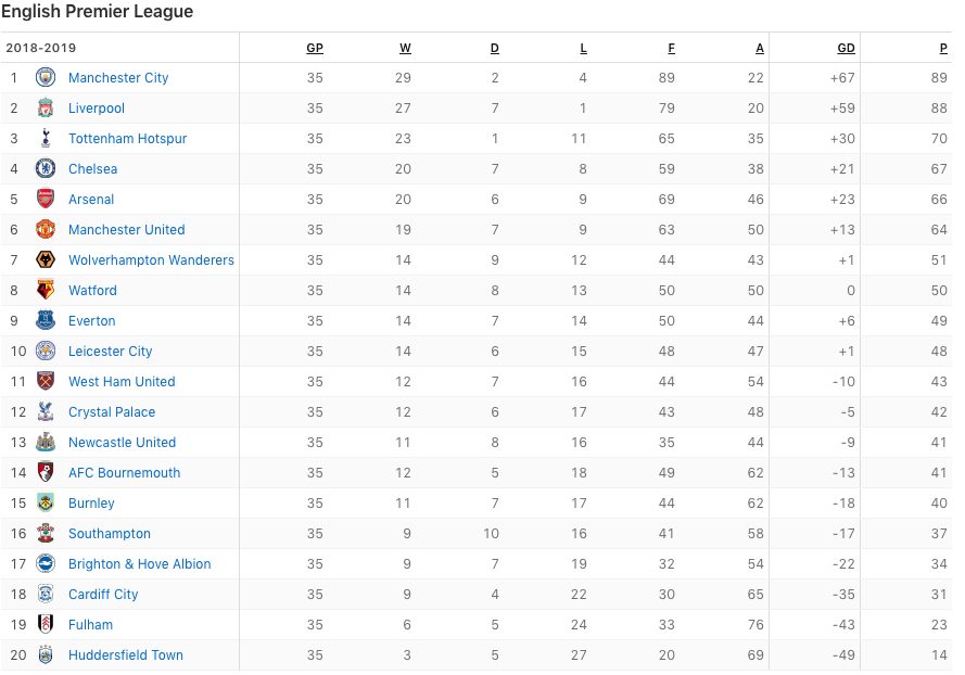 Tottenham đang là CLB nắm lợi thế lớn nhất trong cuộc đua top 4 Premier League mùa này, họ đang xếp ở vị trí thứ 3 trên bảng xếp hạng với 70 điểm sau 35 vòng đấu, Gà trống thành London vẫn còn một trận chưa đá. Hiệu số bàn thắng-bại của Tottenham cũng cao hơn các đối thủ cạnh tranh (+30)