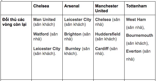 Trong phần còn lại Premier League mùa này, Tottenham sẽ phải đối đầu với các đối thủ bao gồm: West Ham (sân nhà), Bournemouth (sân khách), Everton (sân nhà). Cơ hội để “Gà trống” kết thúc với một vị trí trong top 4 là rất cao.