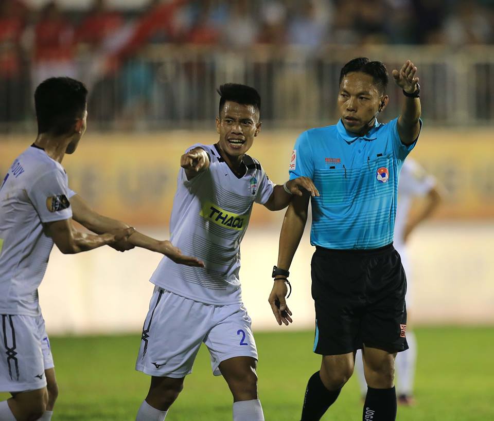 Các cầu thủ HAGL phân bua với trọng tài Nguyễn Ngọc Châu. Ảnh: CLB HAGL.