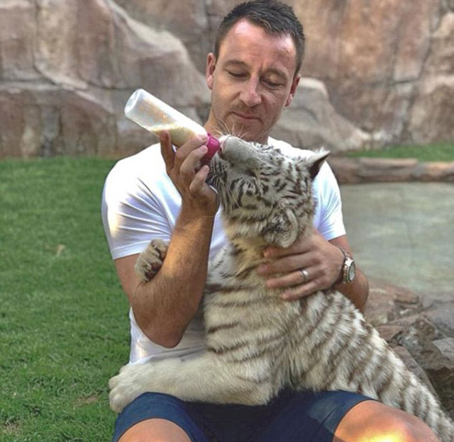 Nhân dịp này, cựu đội trưởng của Chelsea đã tới một trung tâm chăm sóc động vật hoang dã để trải nghiệm việc cho hổ trắng quý hiếm “bú bình”. Theo Terry, đây là một công việc nguy hiểm khi chú hổ có thể gây thương tích cho anh bằng những móng vuốt sắc bén, nhưng nó lại là trải nghiệm tuyệt vời.