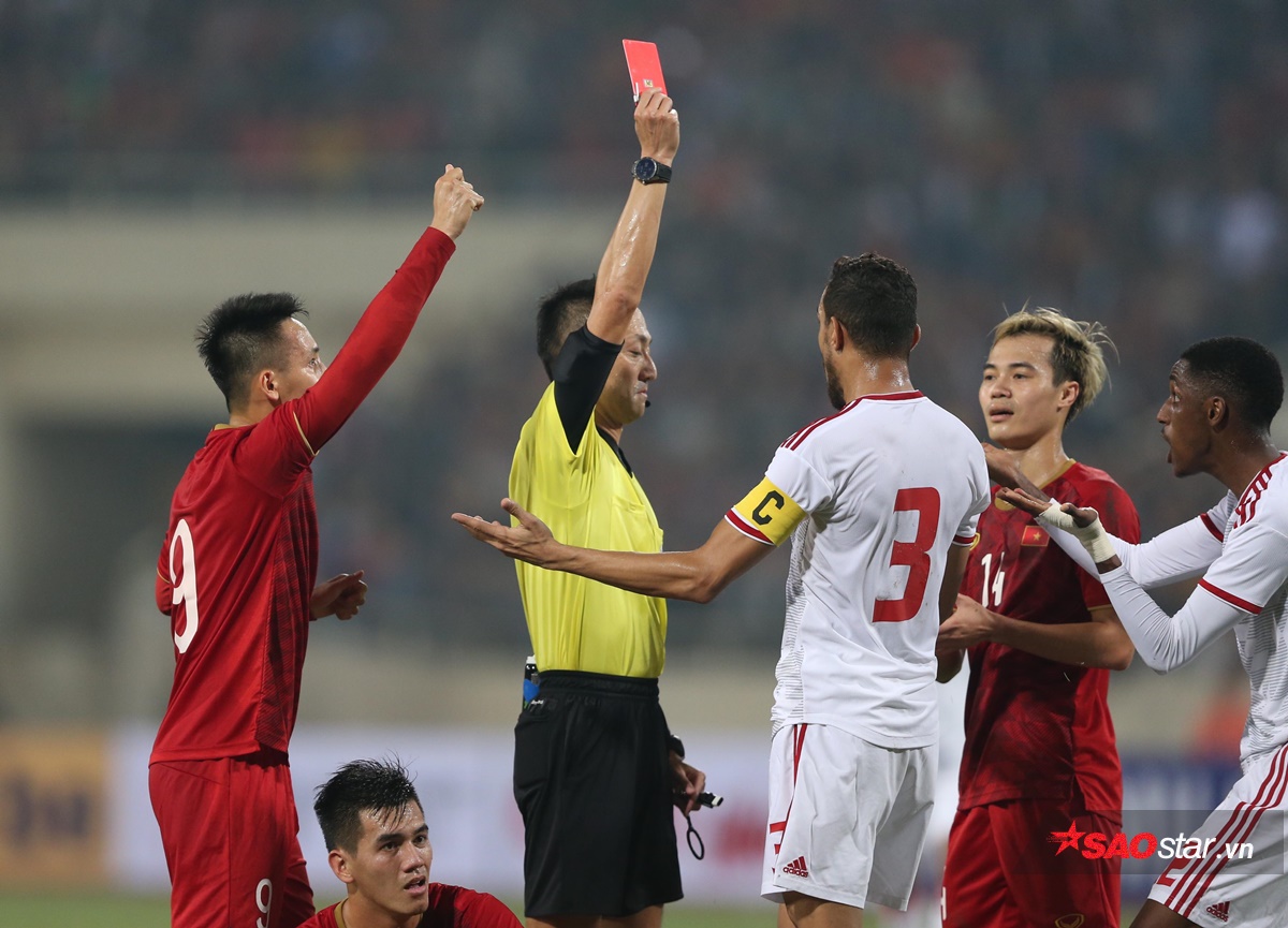 Trận đấu giữa tuyển Việt Nam và UAE đã đổi chiều khi đội chủ nhà có lợi thế hơn người từ phút 39 với việc cầu thủ Tiến Linh bị phạm lỗi, sau đó trọng tài người Nhật Bản rút thẻ đỏ trực tiếp với cầu thủ UAE.