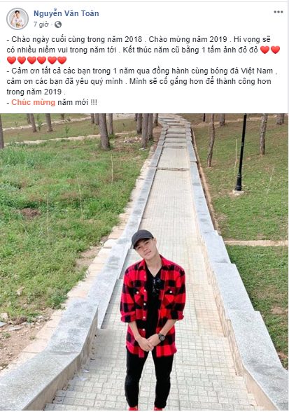 Khác với những bức ảnh nhã nhặn với gam màu trung tính của các đồng đội, Văn Toàn “khác người” với lời chúc rất dài cùng bộ đồ đỏ nổi bật. Năm 2018, riêng cá nhân Văn Toàn chưa được thành công vì những chấn thương không đáng có. Thế nên, một outfit màu đỏ “chất chơi” đầu năm sẽ giúp Văn Toàn trở nên tự tin hơn trong năm tới.