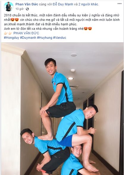 Phan Văn Đức là người đầu tiên đăng status khai xuân cho dàn sao ĐTVN. Tiền vệ người Nghệ An gửi lời chúc mừng năm mới tới gia đình, cha mẹ, người thân và toàn bộ người hâm mộ. Kèm theo lời chúc là bức ảnh rất bắt trend “xếp hình đỉnh cao cùng hội bạn thân” đến từ các cầu thủ Văn Đức, Hồng Duy, Duy Mạnh, Huy Hùng.