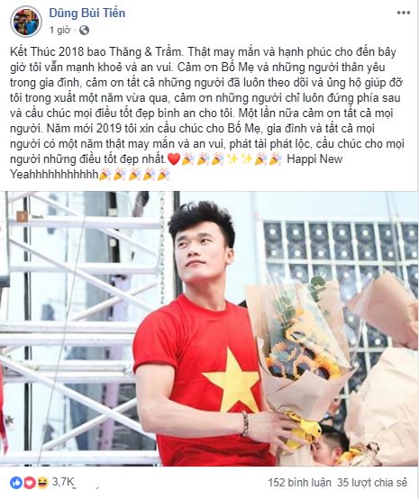“Thủ môn quốc dân” Bùi Tiến Dũng là người đăng status trễ nhất trong dàn sao ĐTVN, gần 2h đêm (giờ Việt Nam). Thủ môn 21 tuổi này đăng tải một dòng trạng thái khá dài với những lời cảm ơn không ngớt dành cho gia đình và người hâm mộ.