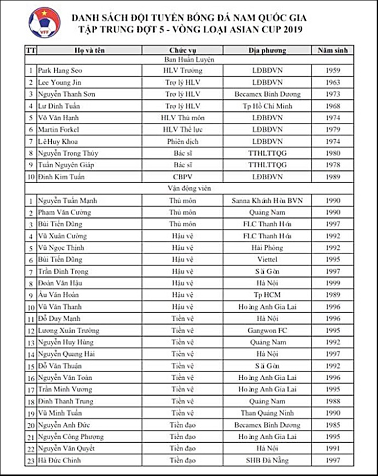 Trong 23 cầu thủ được HLV Park Hang-seo gọi lên tuyển Việt Nam không có bất kỳ cầu thủ nào của SLNA. Chỉ có 3 cầu thủ gốc xứ Nghệ là Công Phượng (HAGL), Âu Văn Hoàn (TP.HCM) và Phạm Văn Cường (Quảng Nam).