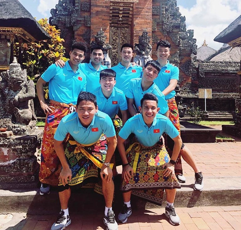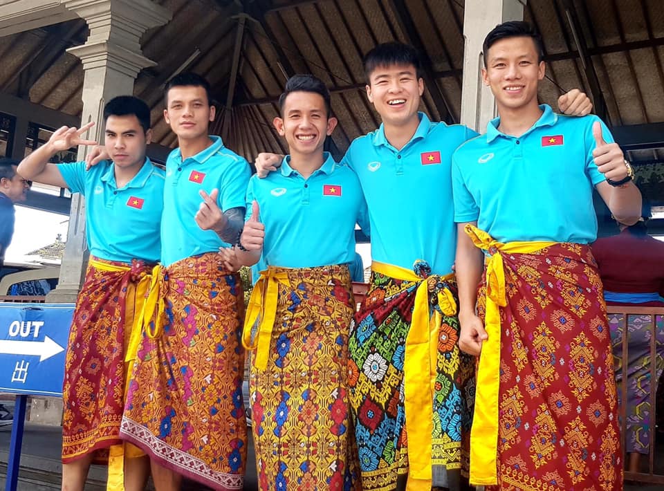 Nhìn chung, dàn sao tuyển Việt Nam khá vui vẻ sau khi hoàn thành nhiệm giành 6 điểm trước Malaysia và Indonesia. Cả đội cũng khiến fan thích thú khi khoác lên mình bộ trang phục đặc trưng của người bản địa. (Ảnh VFF)