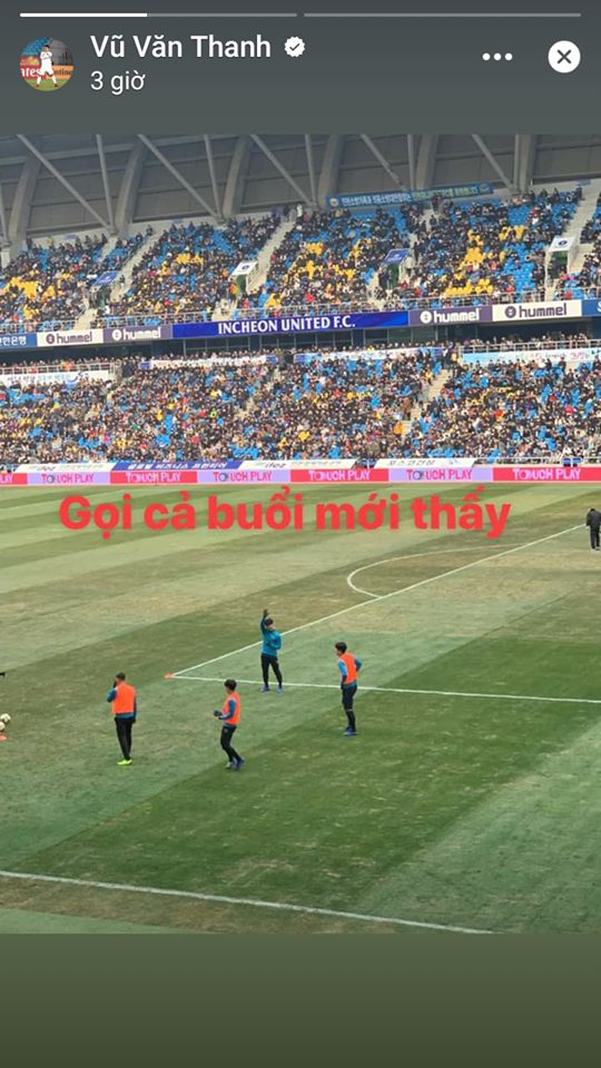 Không những vậy, cầu thủ này còn đăng lên mạng xã hội Instagram dòng trạng thái rất đáng yêu, cùng bức ảnh Công Phượng vẫy tay về phía mình. Theo đó, Văn Thanh mô tả đã rất “nỗ lực”, kêu đến khàn cả giọng để tiền đạo Incheon nhận ra sự có mặt của mình, khi “Gọi cả buổi mới thấy”.